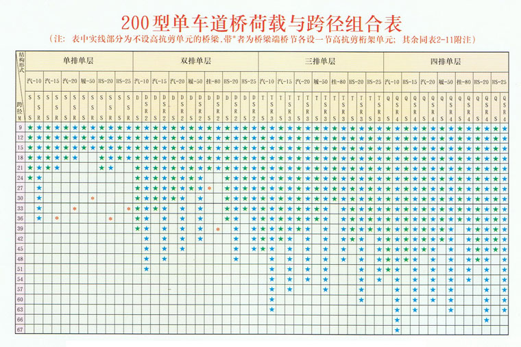 200型单车道桥荷载标准跨径组合表